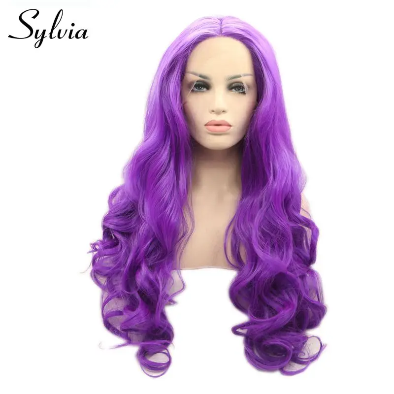 Sylvia natural hairline body wave heat resistant fiber hair purple synthetic lace front wig for women soft lace cosplay wigs body-wave