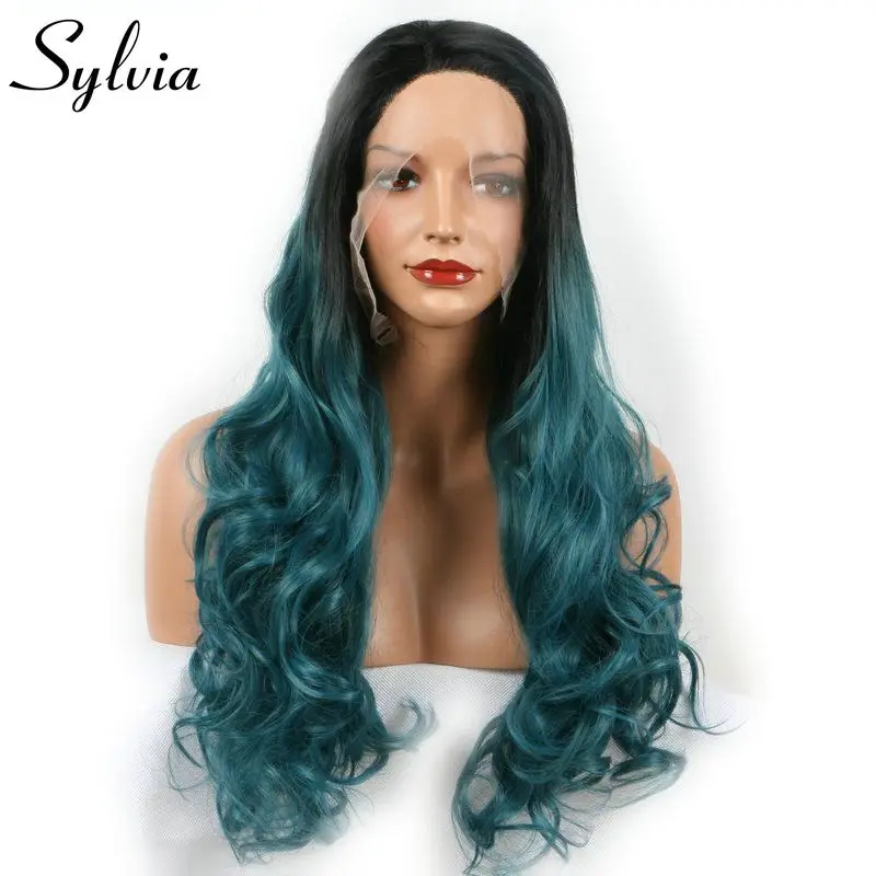 >> Advice Click! <<Sylvia Black To Mixed Green Two Tones Ombre Body Wave Wigs Heat Resistant Fiber Hair With Dark Roots Synthetic Lace Front Wig body-wave